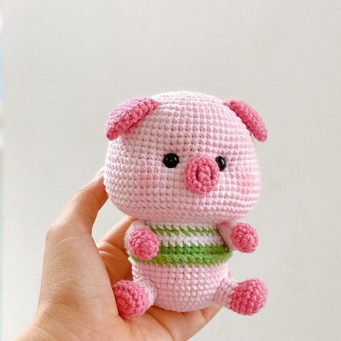 The body is typically crocheted in rounds, starting from the base upward. Gradual increases and decreases help form a plump and stable shape that allows the pig to sit upright.